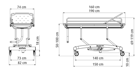 The Amfora is a reliable shower stretcher designed for the ergonomic care and washing of clients. Its hydraulic height adjustment, backrest adjustment, and easy-to-operate side rails ensure both comfort and ease of use. Thanks to the plastic drain tray with hose and the sleek finish, the stretcher is easy to clean and disinfect—ideal for intensive daily use.