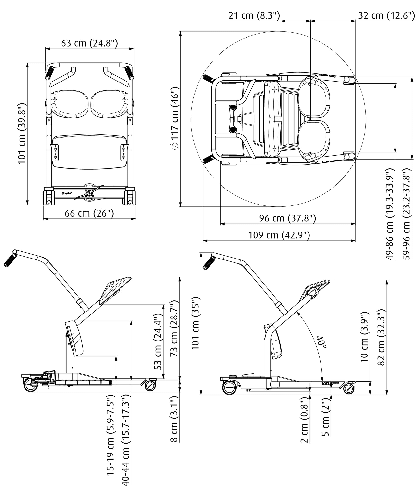 The Lotus Compact is designed for users with an average height between 1.35 m / 53 inch and 1.70 m / 67 inch.