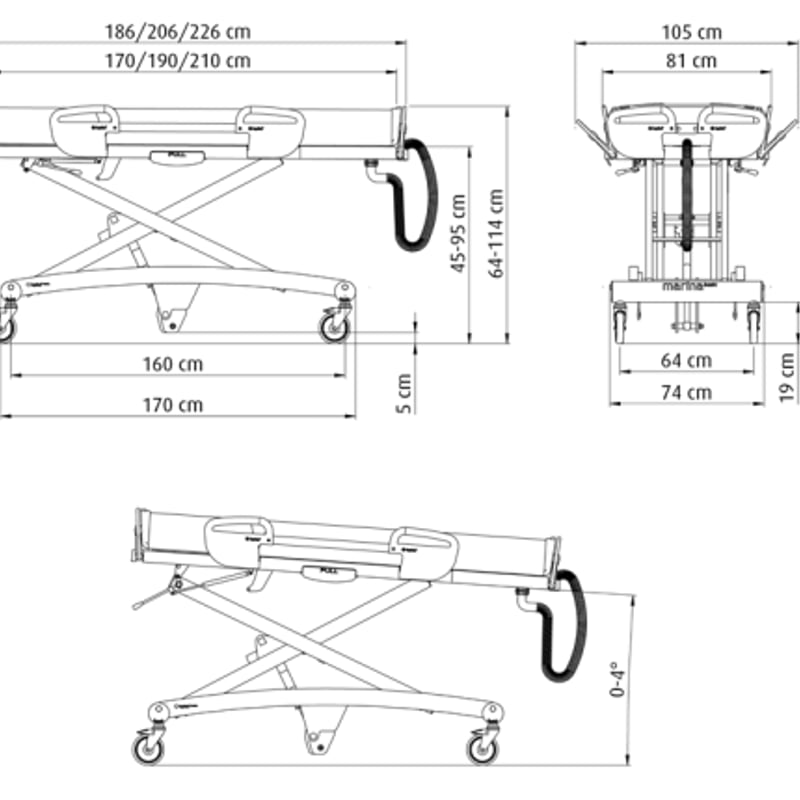 The Marina Basic electric shower trolley combines modern technology with practical usability. The electric height adjustment allows quick and precise setting of the correct working height, while the emergency lowering function and replaceable battery offer added safety and continuity. The antibacterial coating and low-maintenance design contribute to a hygienic working environment. This trolley is suitable for clients up to 227 kg and is ideal for care institutions aiming for efficiency and safety. The electric operation ensures effortless height adjustment, reducing physical strain for the caregiver. Moreover, the design focuses on durability and longevity, making it a valuable investment for any care facility.